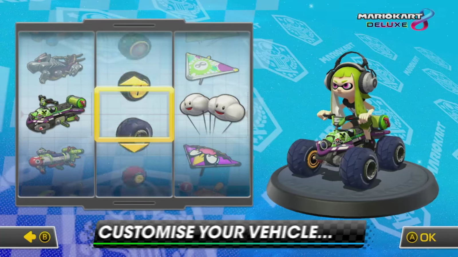 Mario Kart 8 Deluxe terá 48 pistas disponíveis, 5 modos de velocidade, incluindo o 150cc Mirror Mode e 200cc. Os jogadores poderão escolher 42 personagens, com o retorno de King Boo, Dry Bones e Bowser Jr. Novos personagens de Splatoon 2 estarão no jogo, o Inkling Boy e a Inkling Girl. Eles virão com novas partes para customizar seu veículo e a arena Urchin Underpass para o Modo Batalha.